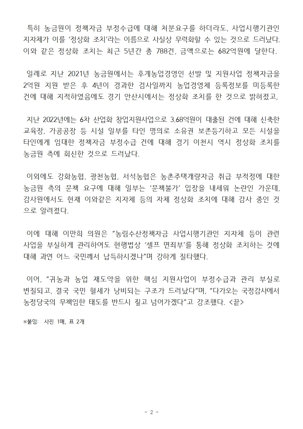 [이만희 의원/국감보도자료] 지자체 ‘셀프면죄부’에 45조원 규모 농림수산정책자금 관리 속수무책