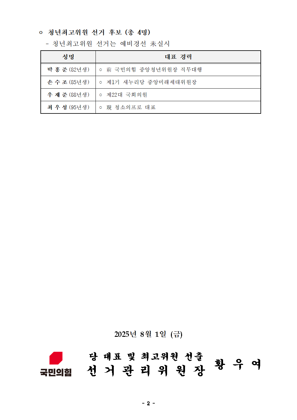 국민의힘 당 대표 및 최고위원 선거 예비경선 진출자 공고