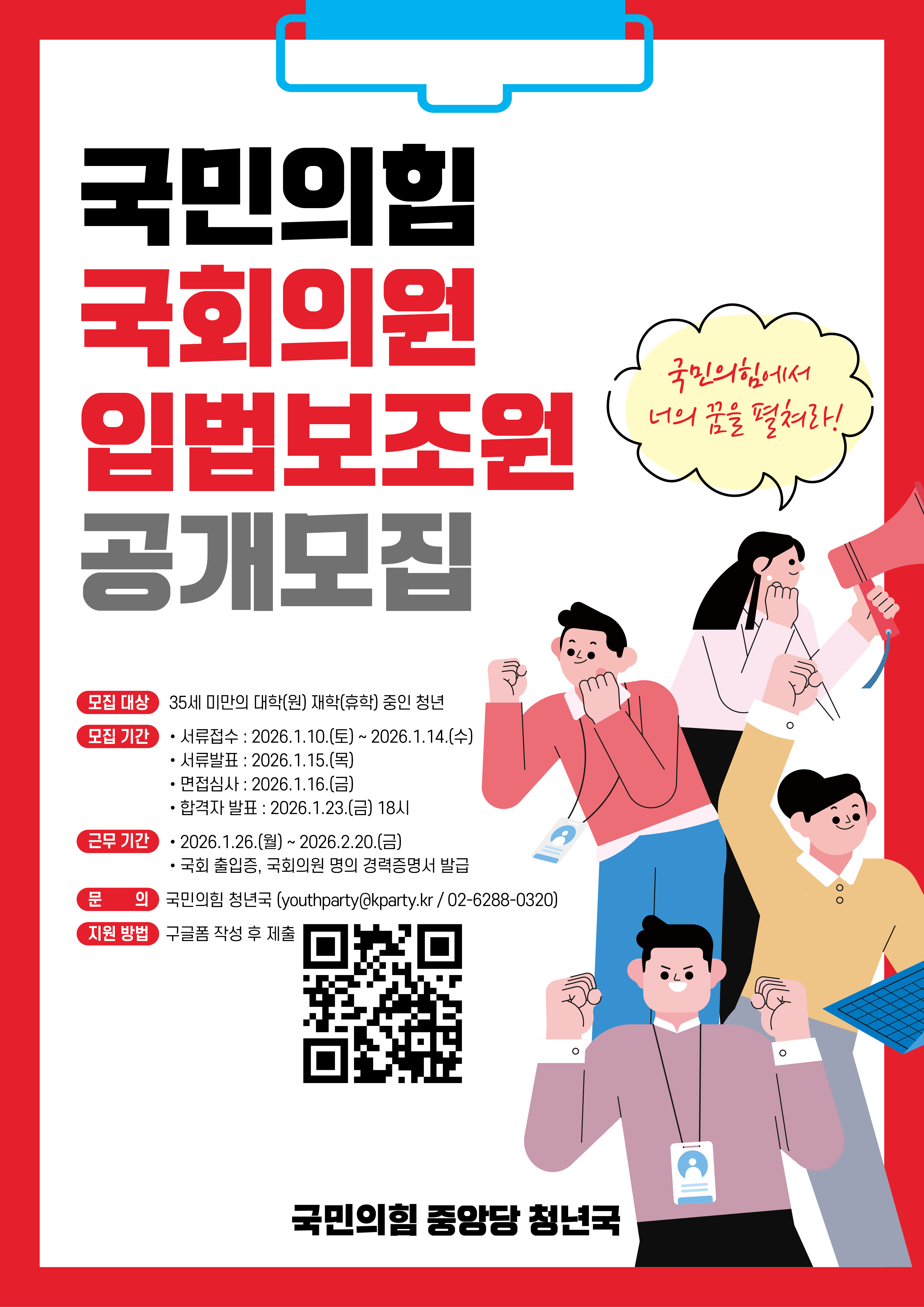 「국민의힘에서 너의 꿈을 펼쳐라!」 국민의힘 국회의원 입법보조원 공개모집