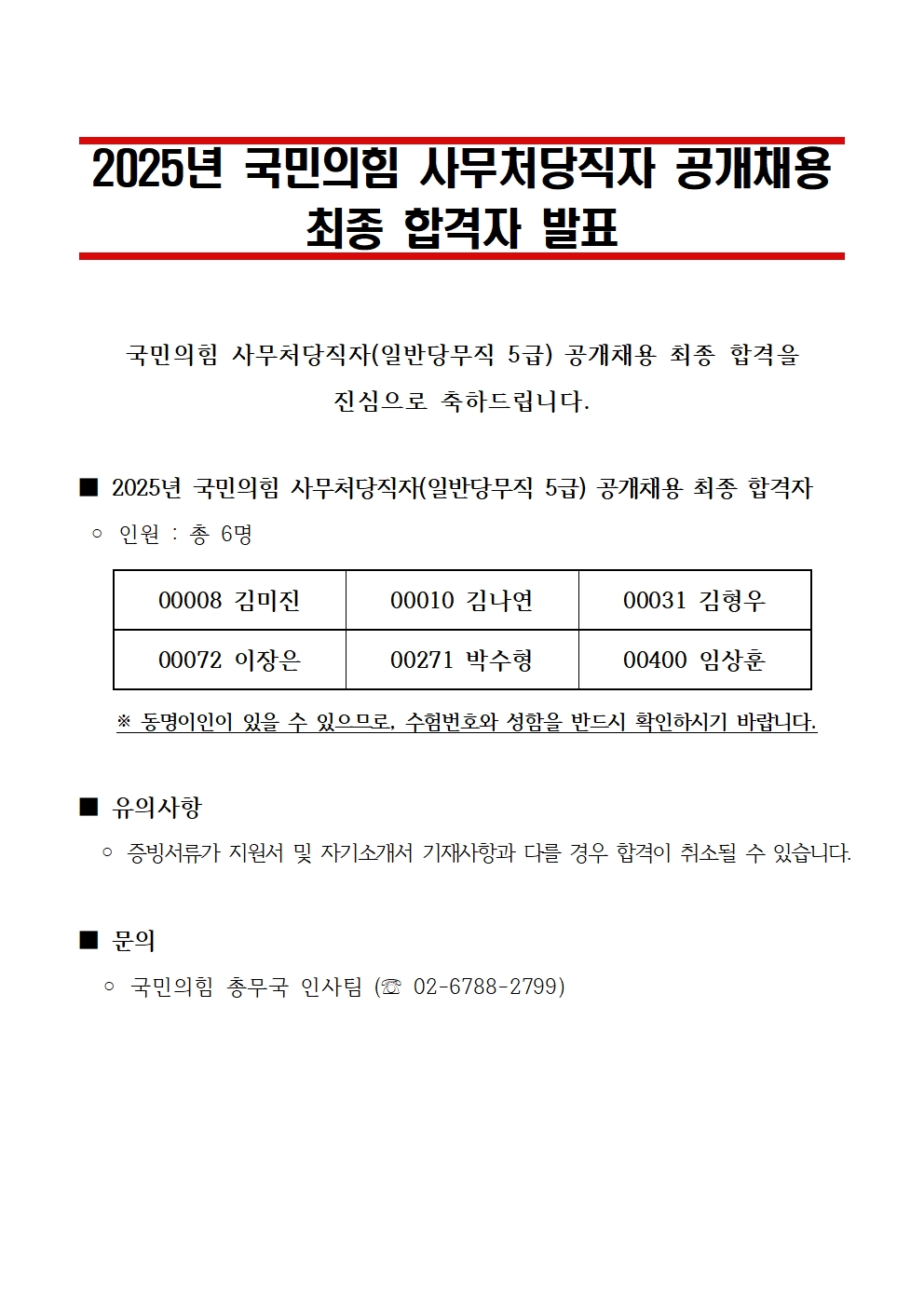 2025년 국민의힘 사무처당직자 공개채용 최종 합격자 발표