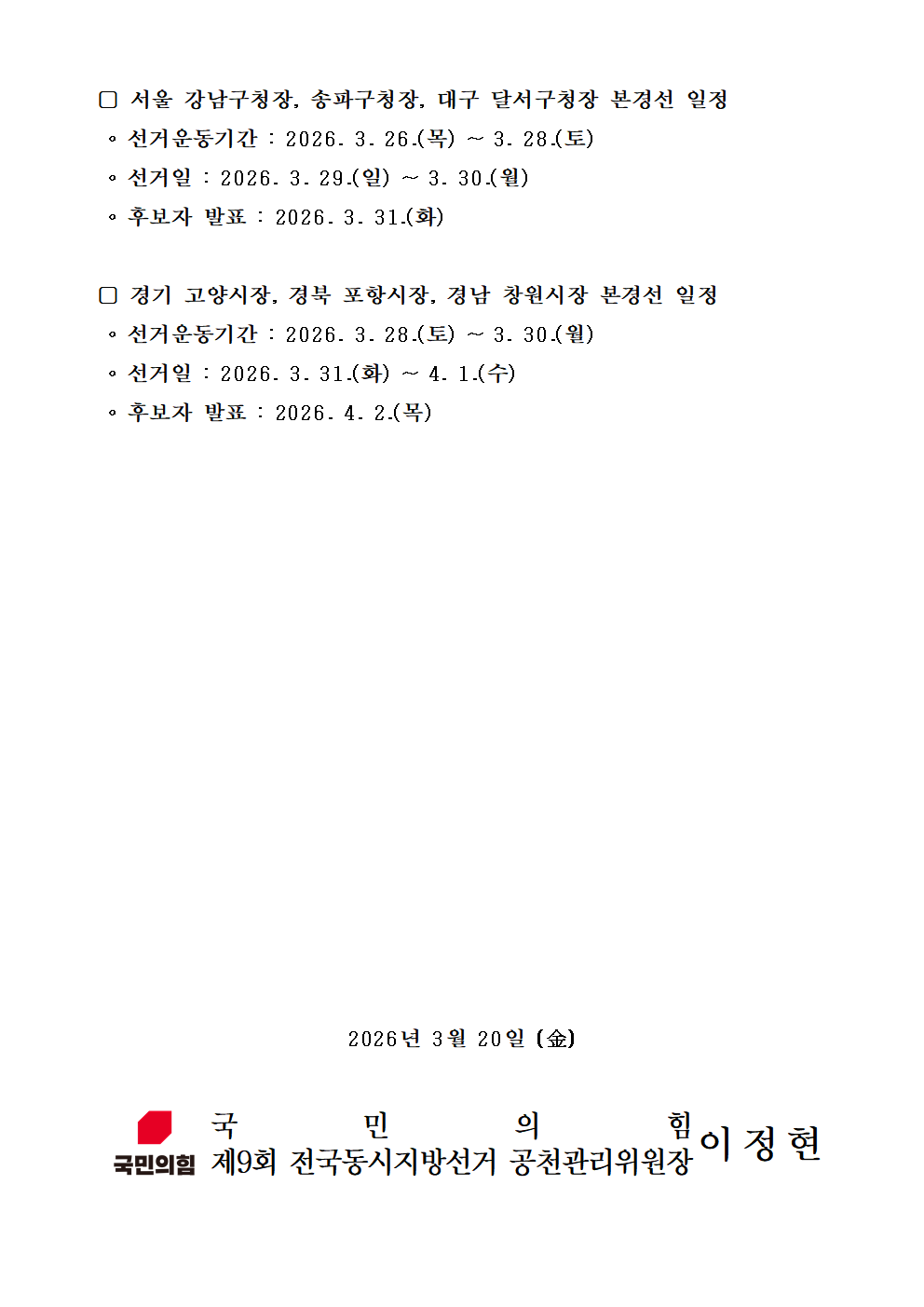 제9회 전국동시지방선거 기초단체장 후보자 선출을 위한 본경선 후보자 등록 결과 등 공고
