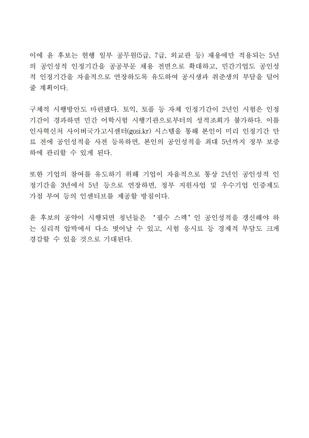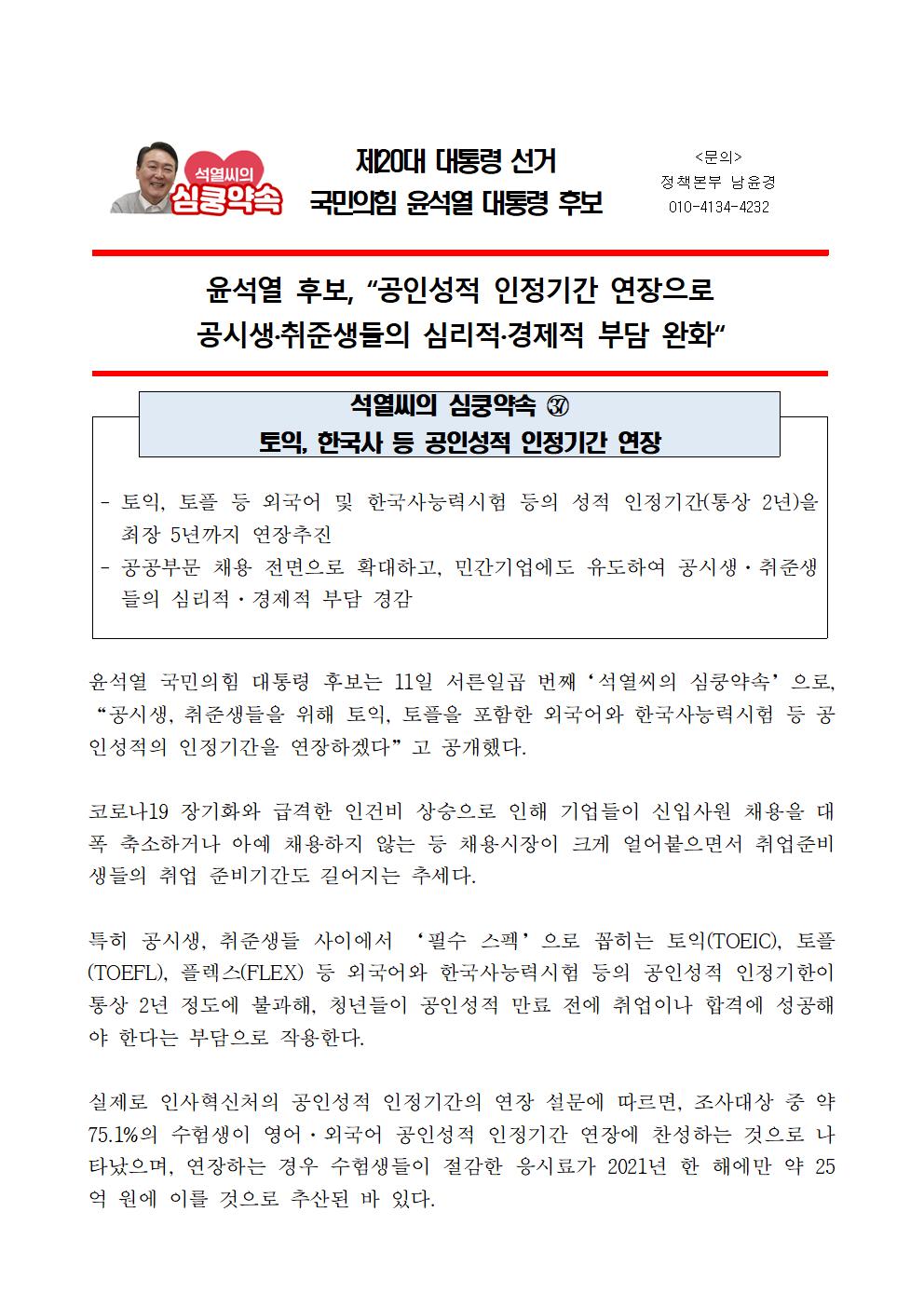 [보도자료] 석열씨의 심쿵약속-취준생 위해 토익, 한국사 등 공인성적 인정기간 연장