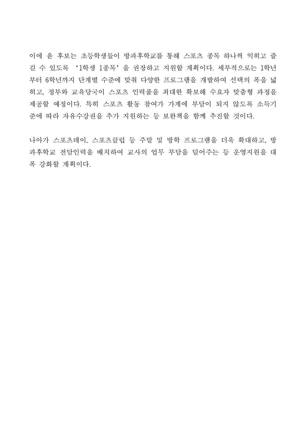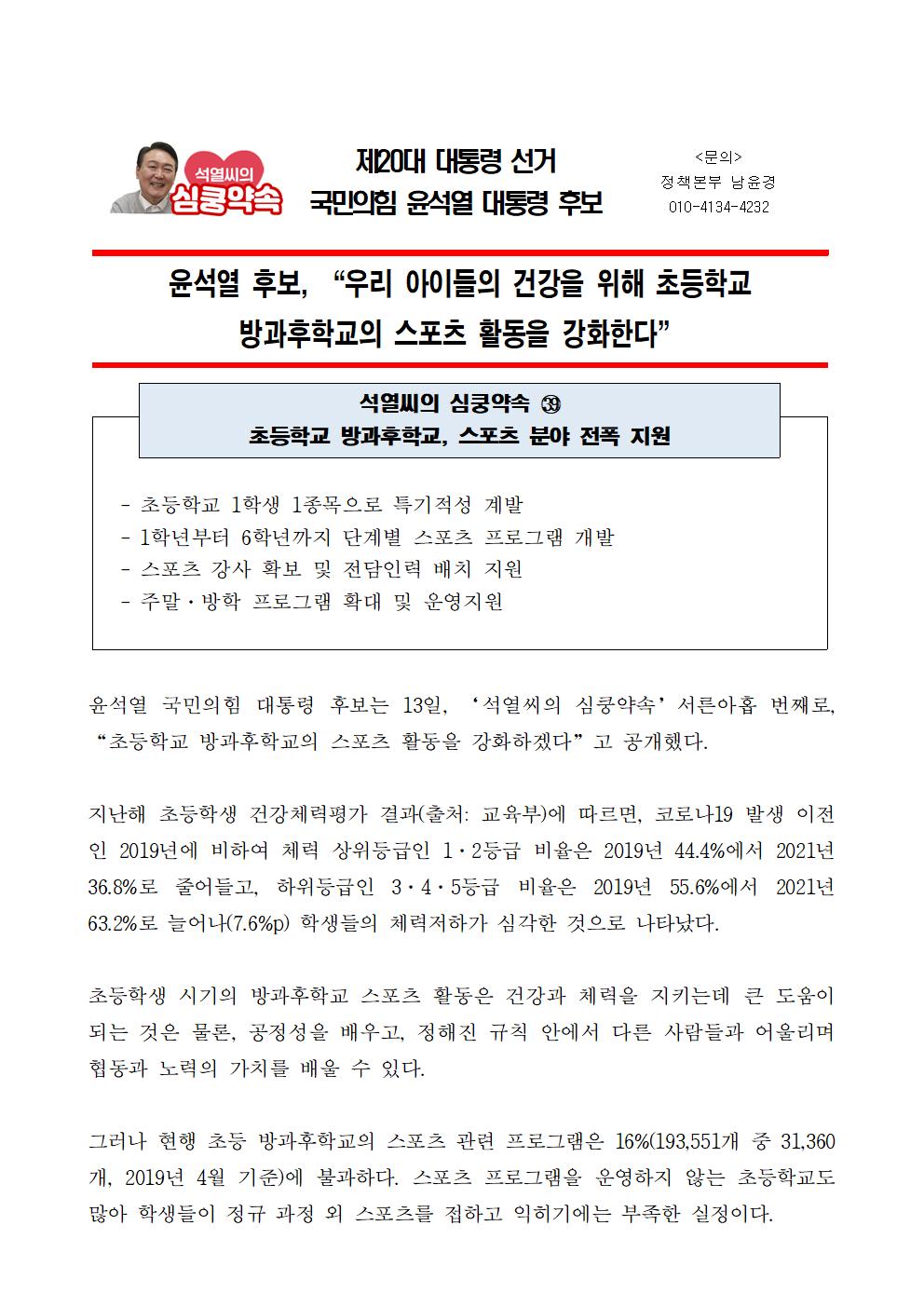 [보도자료] 석열씨의 심쿵약속-초등학교 방과후학교의 스포츠 활동 강화