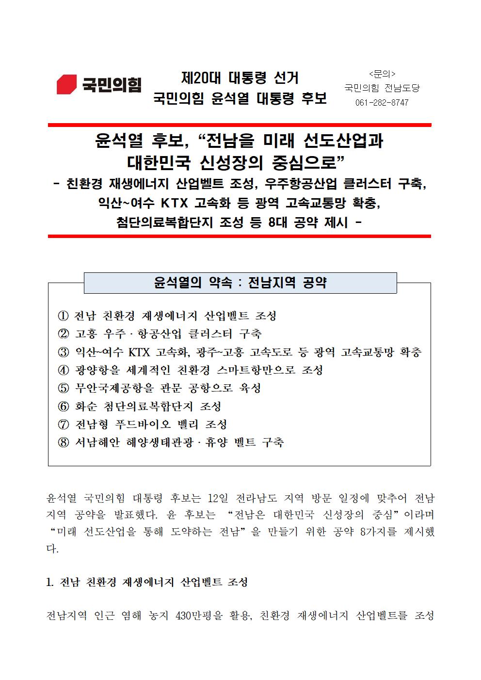 [보도자료] 윤석열 후보, "전남을 미래 선도산업과 대한민국 신성장의 중심으로"