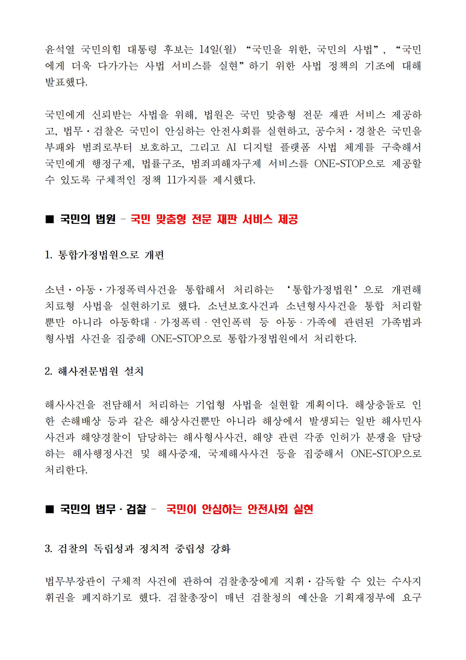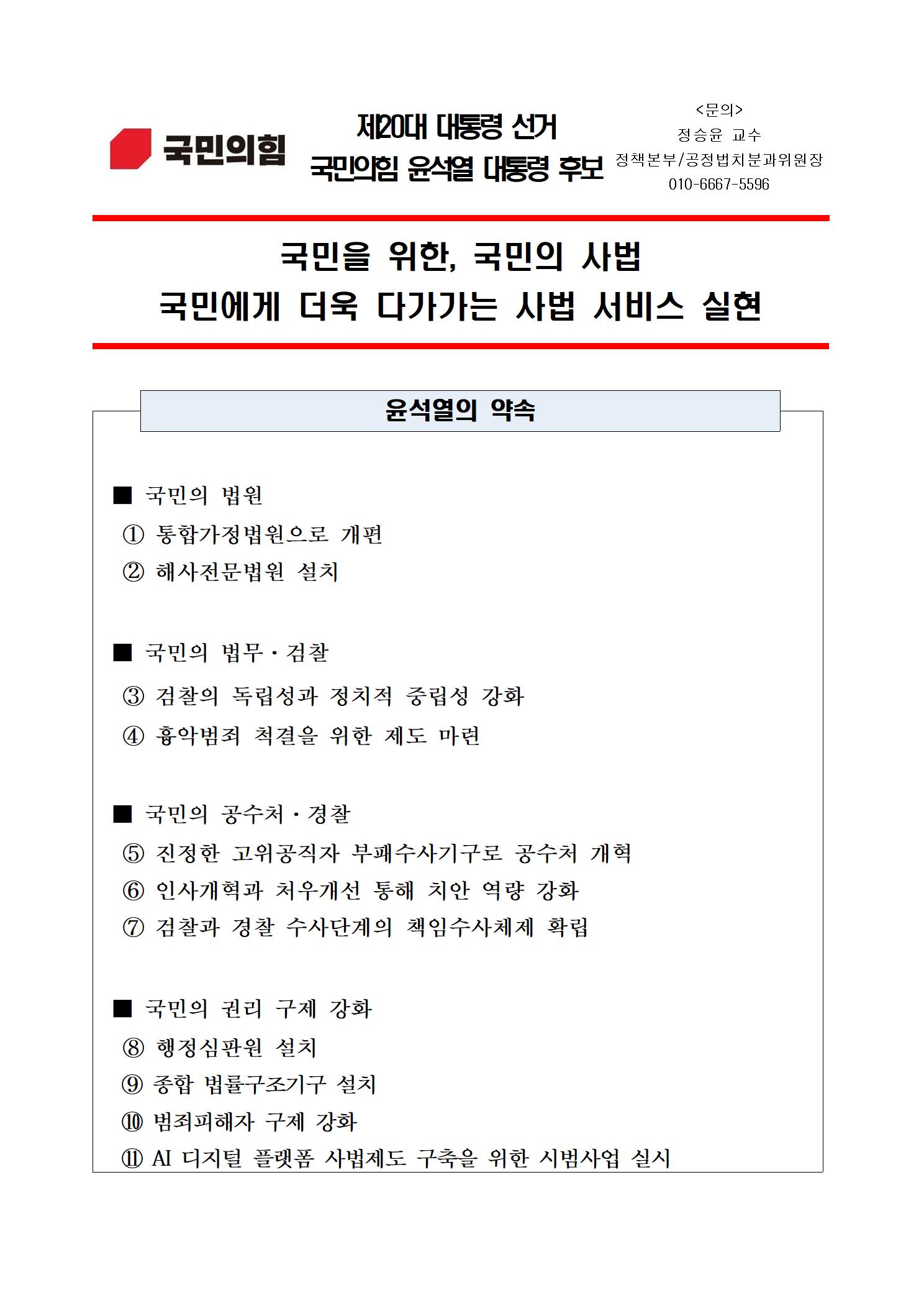 [보도자료] 윤석열 후보,국민을 위한, 국민의 사법,국민에게 더욱 다가가는 사법 서비스 실현