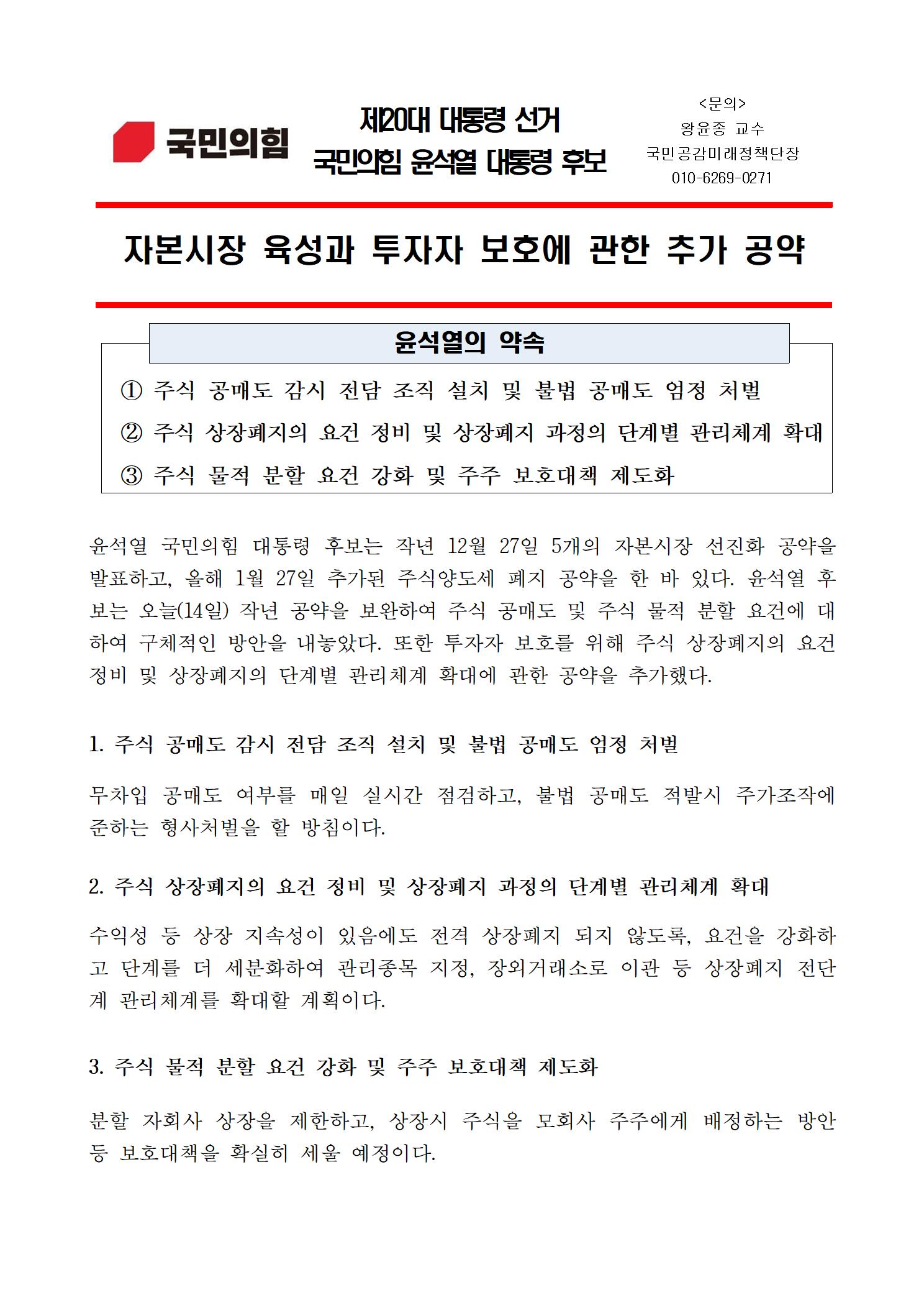 [보도자료] 윤석열후보, 자본시장 육성과 투자자 보호에 관한 추가 공약