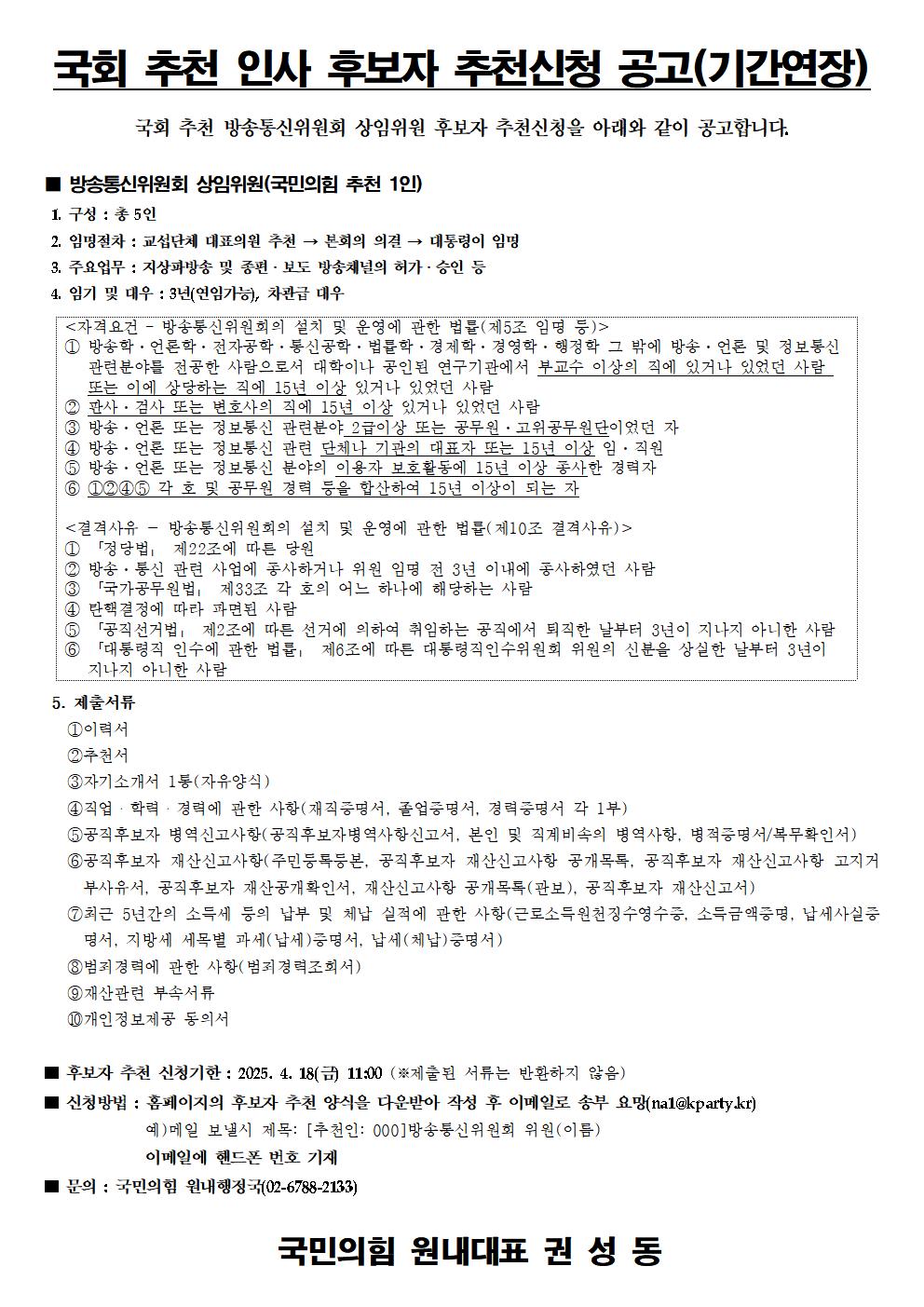 방송통신위원회 상임위원 후보자 추천신청 공고(기간연장)