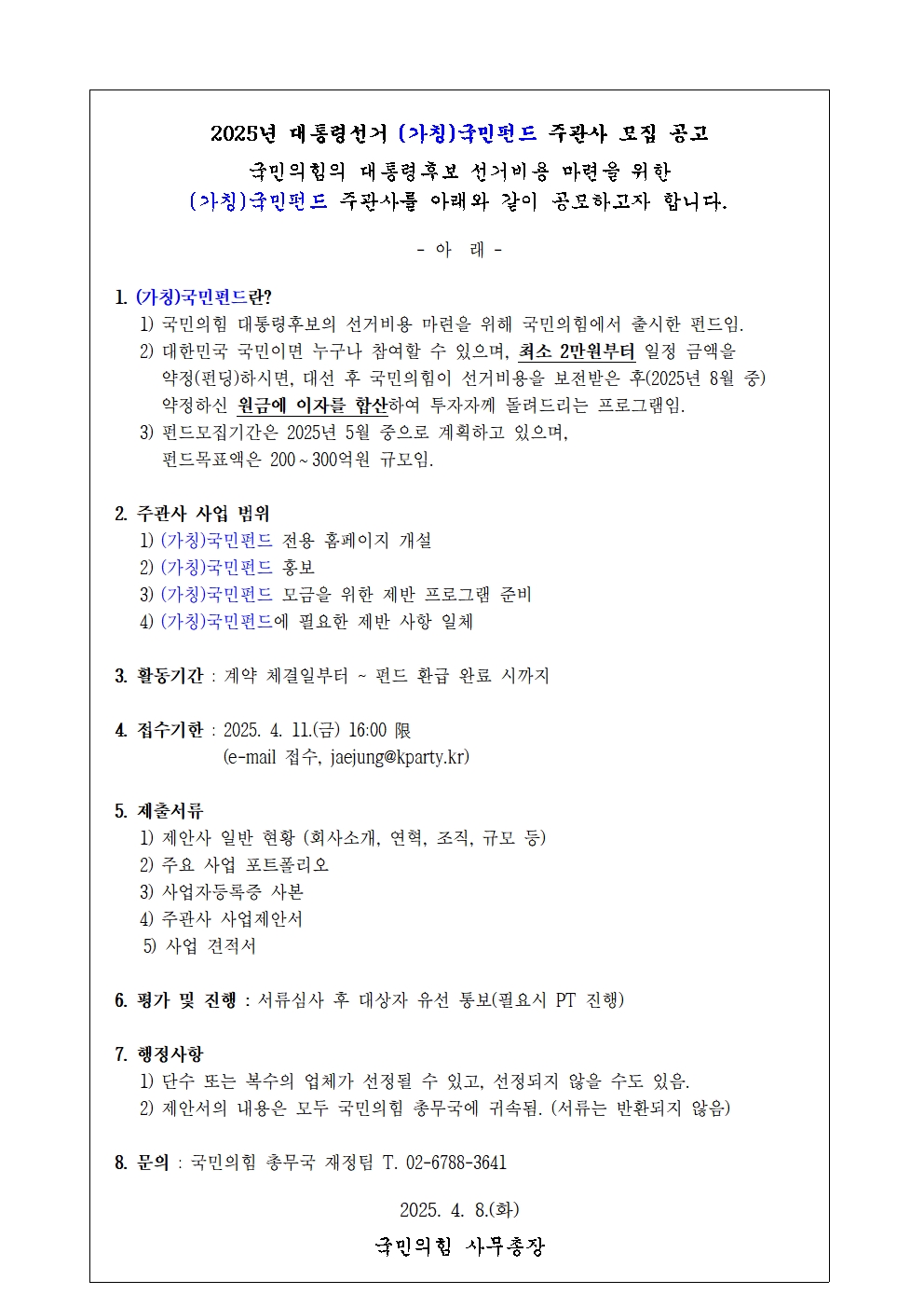2025년 대통령선거 (가칭)국민펀드 주관사 모집 공고