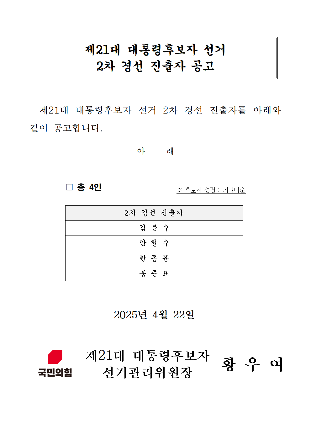 제21대 대통령후보자 선거 2차 경선진출자 공고