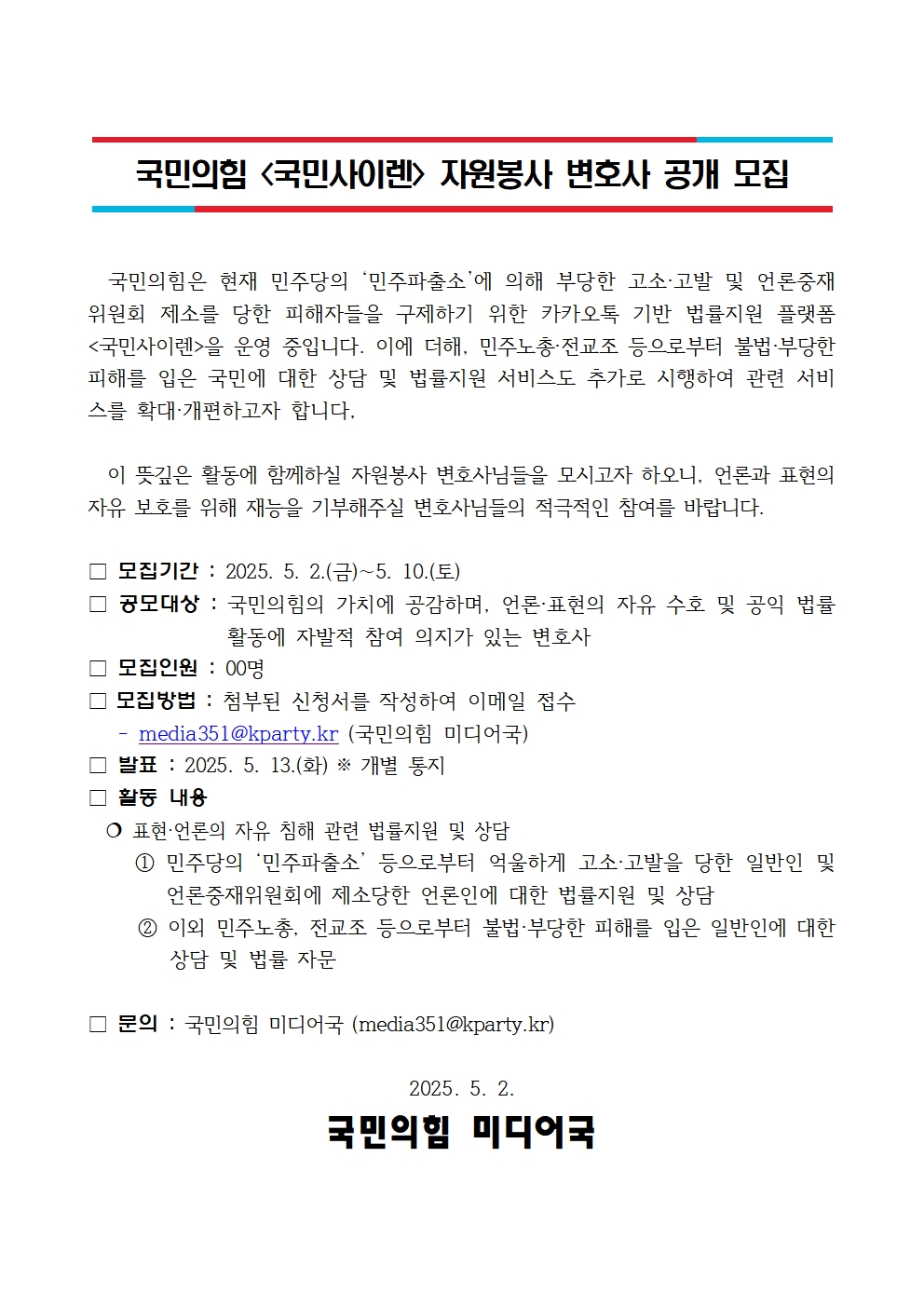국민의힘 국민사이렌 자원봉사 변호사 공개 모집