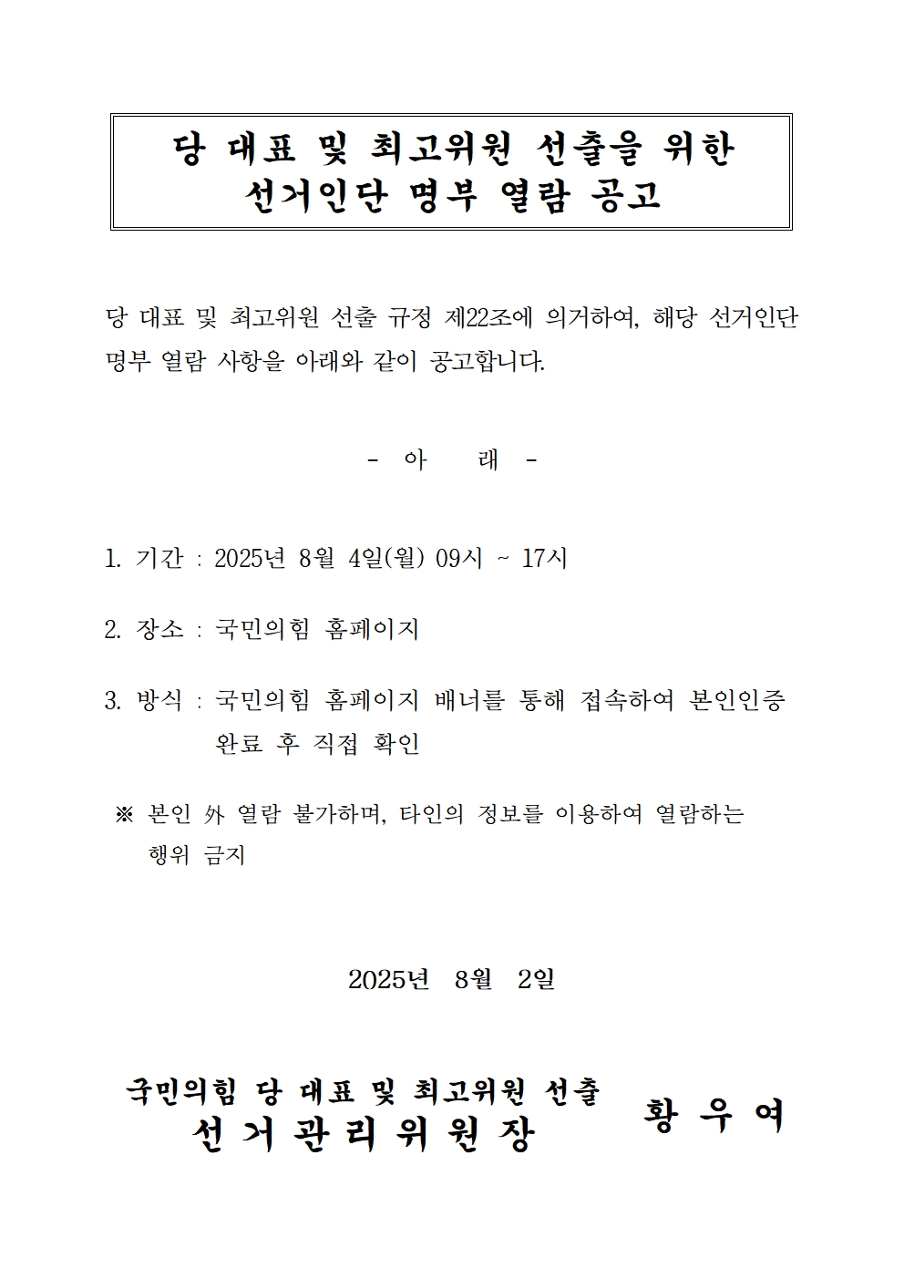 당 대표 및 최고위원 선출을 위한 선거인단 명부 열람 공고