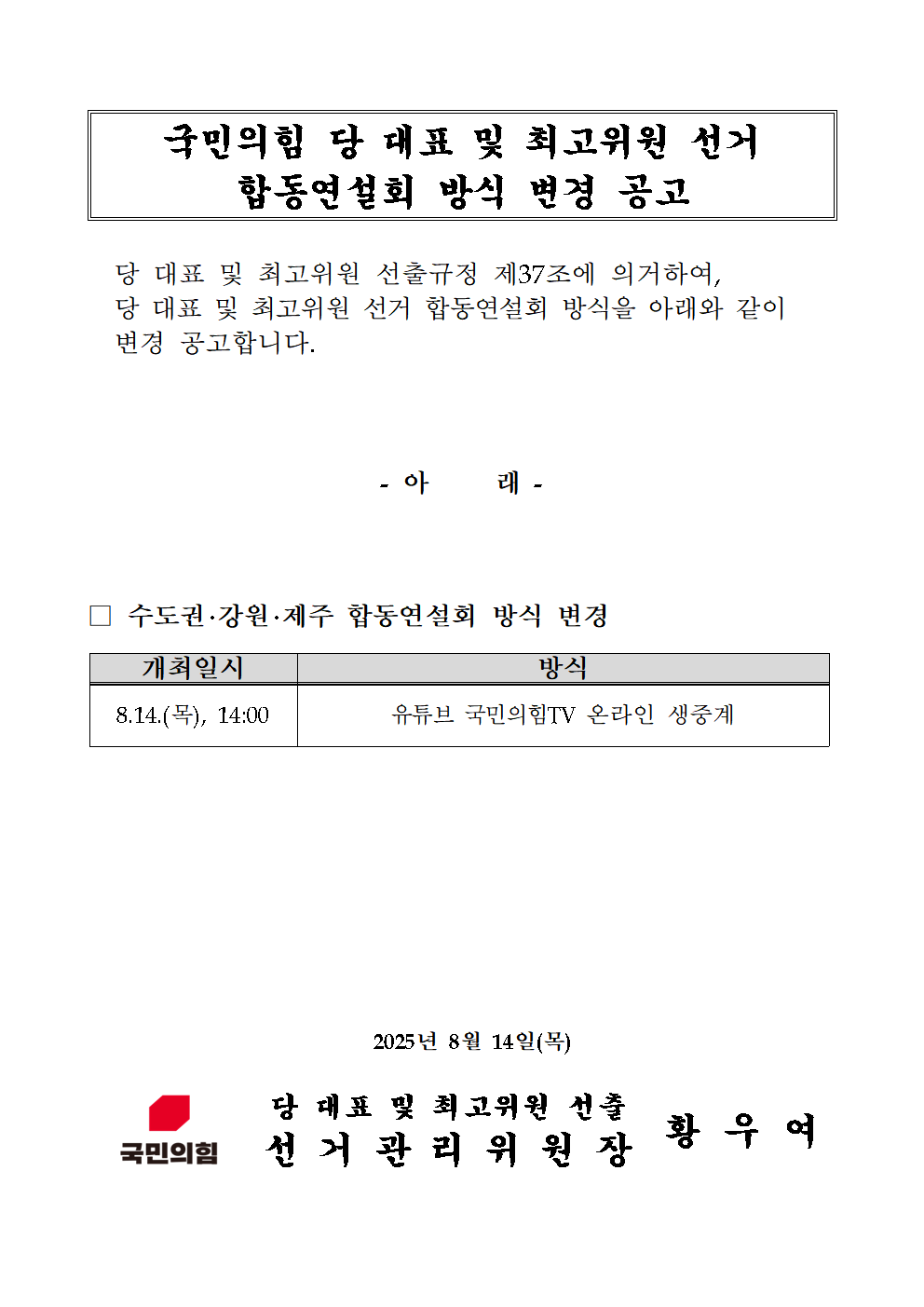 국민의힘 당 대표 및 최고위원 선거 합동연설회 방식 변경 공고