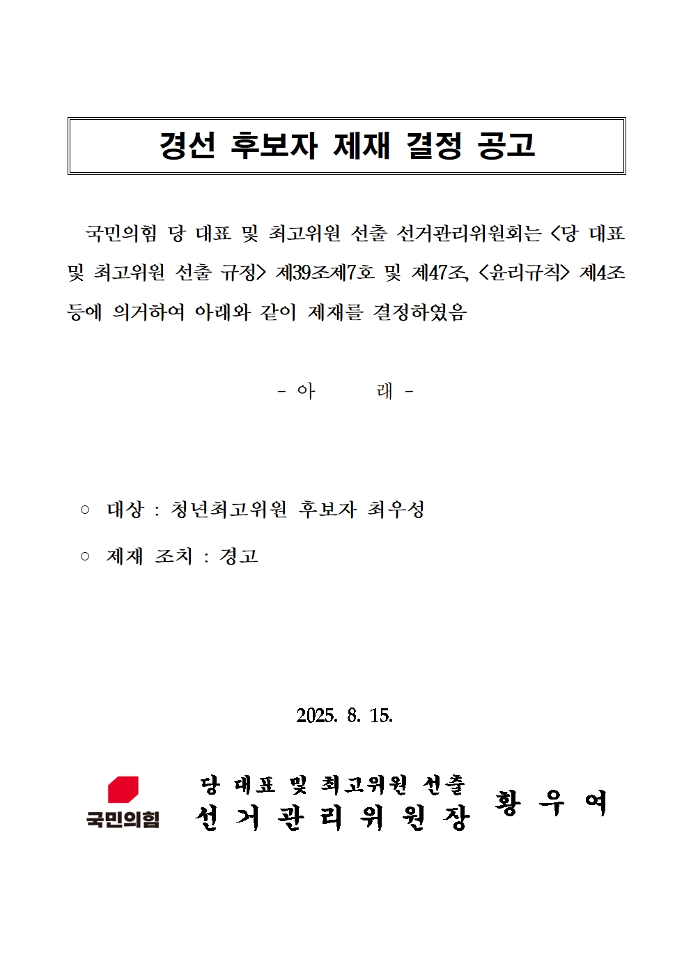 당 대표 및 최고위원 선거 후보자 제재 공고