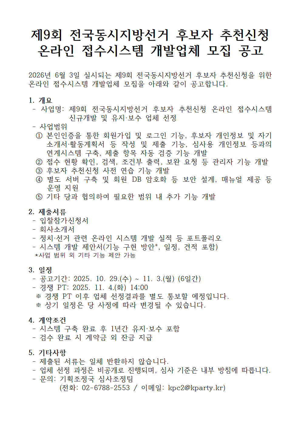 제9회 전국동시지방선거 후보자 추천신청 온라인 접수시스템 개발업체 모집 공고